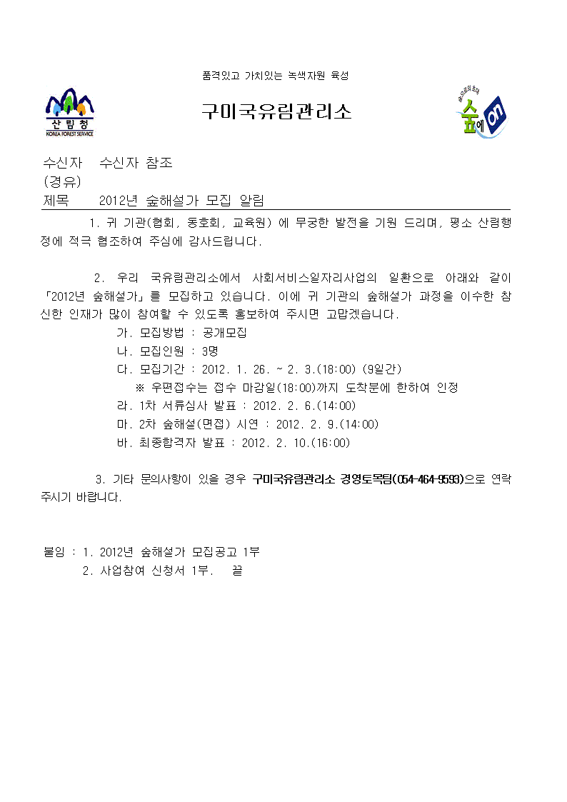구미국유림관리소에서는 사회 서비스 일자리 사업의 일환으로 「2012년 숲해설가」를 모집하고 있습니다. 관심있는 분들은 첨부파일을 참조하시기 바랍니다.