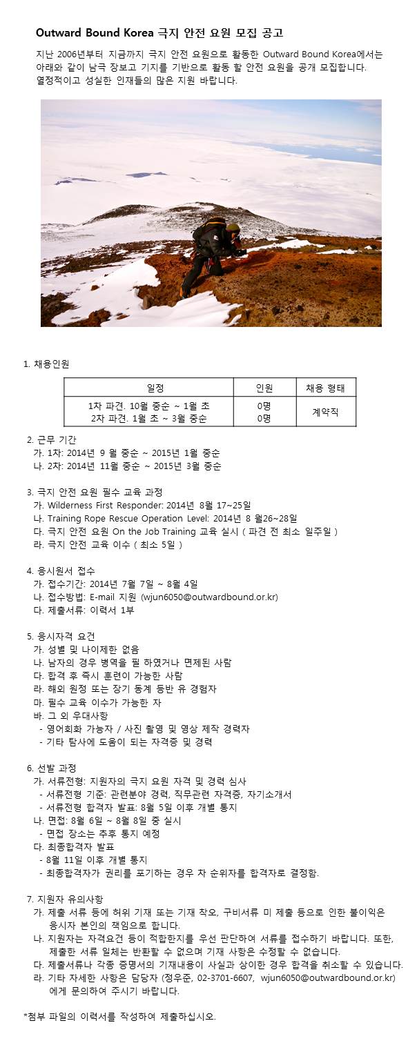 극지 안전요원 모집 공고 작성자 정보 관리자 작성 3,899 조회 작성일 2014.07.09 16:59 컨텐츠 정보 0 댓글 본문 SNS 공유 관련자료 댓글 0개 등록된 댓글이 없습니다. 로그인한 회원만 댓글 등록이 가능합니다. 이전 [訃告] 서울특별시산악연맹 복인규 자문위원 작성일 2014.07.12 다음 訃告 - 정순택 前 대한산악연맹 부회장 작성일 2014.07.01 목록