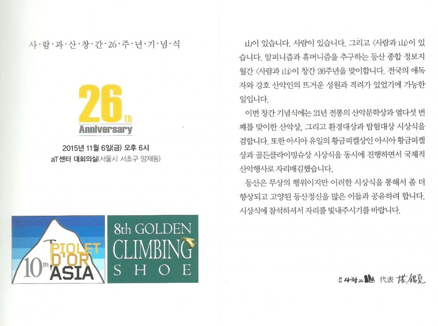 월간 사람과 산 창간행사에 초대합니다. 작성자 정보 허샤르레 작성 4,217 조회 작성일 2015.10.30 16:36 컨텐츠 정보 0 댓글 본문 안녕하십니까? 늘 사람과 산의 행사에 애정 어린 관심을 갖고 참석해 주신 데 대해, 충심으로 감사드리며 2015년에도 자리를 빛내주시길 부탁드립니다. SNS 공유 관련자료 댓글 0개 등록된 댓글이 없습니다. 로그인한 회원만 댓글 등록이 가능합니다. 이전 訃告 박정헌 학술문화이사 모친상 작성일 2015.10.31 다음 訃告 - 김영식 청소년이사 빙부상 작성일 2015.10.19 목록