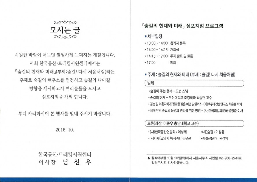 숲길의 현재와 미래 심포지엄 안내 작성자 정보 관리자 작성 3,129 조회 작성일 2016.10.20 15:58 컨텐츠 정보 0 댓글 본문 SNS 공유 관련자료 댓글 0개 등록된 댓글이 없습니다. 로그인한 회원만 댓글 등록이 가능합니다. 이전 2016년 국립산악박물관 박영석 특별전 안내 작성일 2016.11.03 다음 [訃告] 제주도산악협회 박희수 회장 부친상 작성일 2016.10.14 목록
