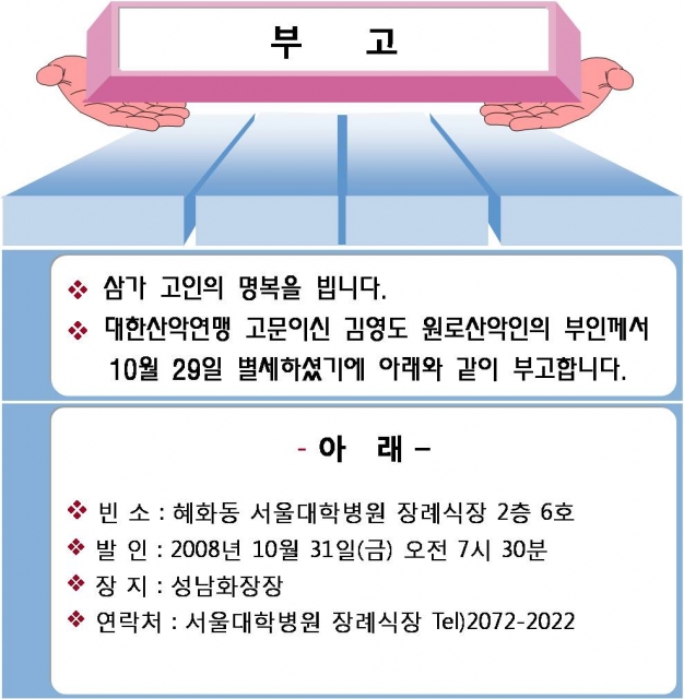 부고 - 고문 김영도 원로산악인 부인상 안내 작성자 정보 대한산악연맹 작성 7,825 조회 작성일 2009.03.01 21:55 컨텐츠 정보 0 댓글 본문 . SNS 공유 관련자료 댓글 0개 등록된 댓글이 없습니다. 로그인한 회원만 댓글 등록이 가능합니다. 이전 부고 - 前 감사 홍인표 작성일 2009.03.01 다음 서울시연맹 이규한사무국장 장남 결혼식 안내 작성일 2009.03.01 목록