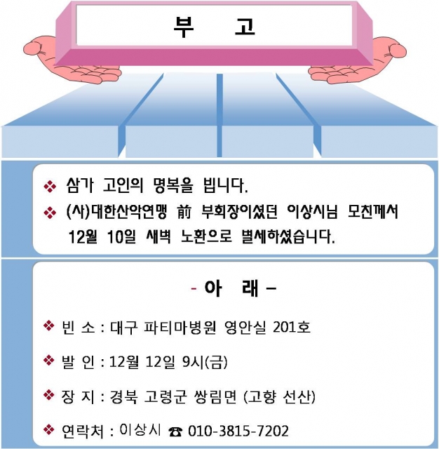 부고 - 이상시 前 부회장 모친상 작성자 정보 대한산악연맹 작성 6,903 조회 작성일 2009.03.01 22:00 컨텐츠 정보 0 댓글 본문 . SNS 공유 관련자료 댓글 0개 등록된 댓글이 없습니다. 로그인한 회원만 댓글 등록이 가능합니다. 이전 부고 - 대구연맹 前 회장 김건섭 작성일 2009.03.01 다음 부고 - 경북연맹 이용숙부회장 모친상 작성일 2009.03.01 목록
