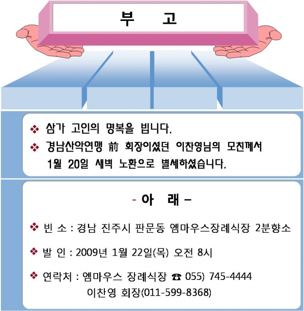부고 - 경남연맹 이찬영 前회장 모친상 작성자 정보 대한산악연맹 작성 7,248 조회 작성일 2009.03.01 22:04 컨텐츠 정보 0 댓글 본문 . SNS 공유 관련자료 댓글 0개 등록된 댓글이 없습니다. 로그인한 회원만 댓글 등록이 가능합니다. 이전 부고 - 산악인 故 김형주 작성일 2009.03.01 다음 부고 - 대구연맹 前 회장 김건섭 작성일 2009.03.01 목록